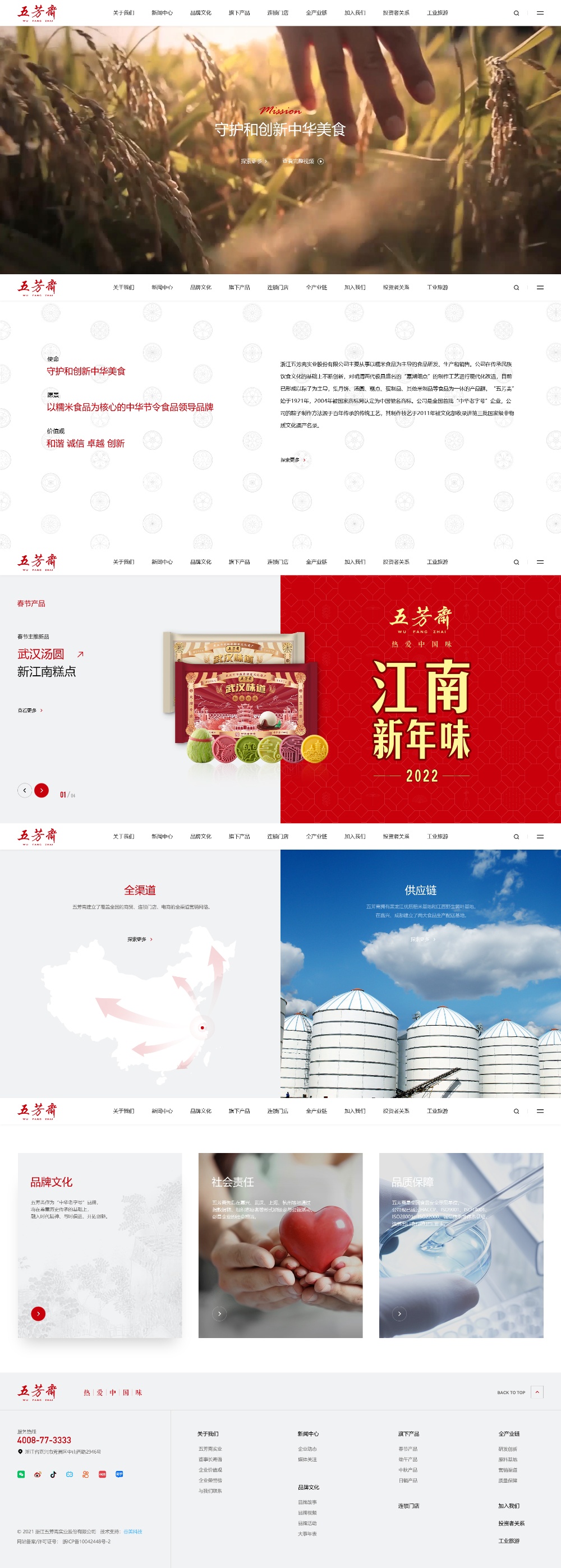 浙江五芳斋实业股份有限公司主要从事以糯米食品为主导的食品研发、生产和销售。公司在传承民族饮食文化的基础上不断创新,对明清两代极具盛名的“嘉湖细点”的制作工艺进行现代化改造,目前已形成以粽子为主导,集月饼、汤圆、糕点、蛋制品、其他米制品等食品为一体的产品群,拥有黑龙江优质稻米基地和江西高山箬叶基地,在嘉兴、成都建立了两大食品生产配送基地,并建立起覆盖全国的商贸、连锁门店、电商的全渠道营销网络。五芳斋致力于传统食品的科技创新,设有食品研究所和浙江省博士后工作站,是《粽子》国际标准主导起草者以及《粽子》行业标准的制定者。